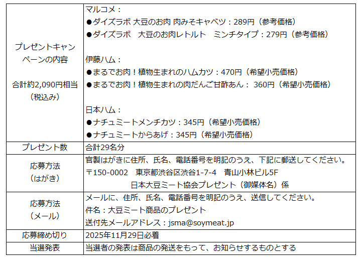 日本大豆ミート協会(所在地:東京渋谷区、会長:青木 時男:マルコメ株式会社 代表取締役社長、以下、大豆ミート協会)は、10月29日の「おいしい大豆ミートの日」を記念して、合計29名に「おいしい大豆ミート商品の詰め合わせセット」をプレゼントするキャンペーンを実施します。